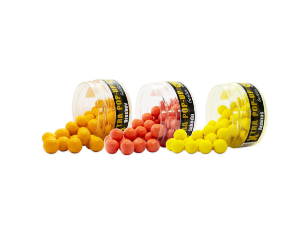 Xtra pop-up je plovoucí boilies s extra vysokým výtlakem. Navíc je zatraktivněno zalitím čistou esencí přímo do dozy. Plovoucí boilies je velice atraktivní nástraha pro celoroční rybolov. Vyznačuje se vysokým vztlakem. Při výrobě byly použity kvalitní esenciální atraktory, které z tohoto boilies dělají vysoce účinnou nástrahu. Pop-up je možno používat samostatně nebo v kombinaci s potápivým boilies. Tyto pop up jsou navíc zalité čistou esencí přímo do dózy.