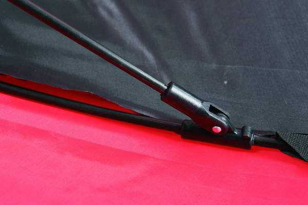 Klasický, velmi lehký deštník s nylonovým potahem v kombinaci černé a červené barvy. Je osazen kvalitním kloubem.