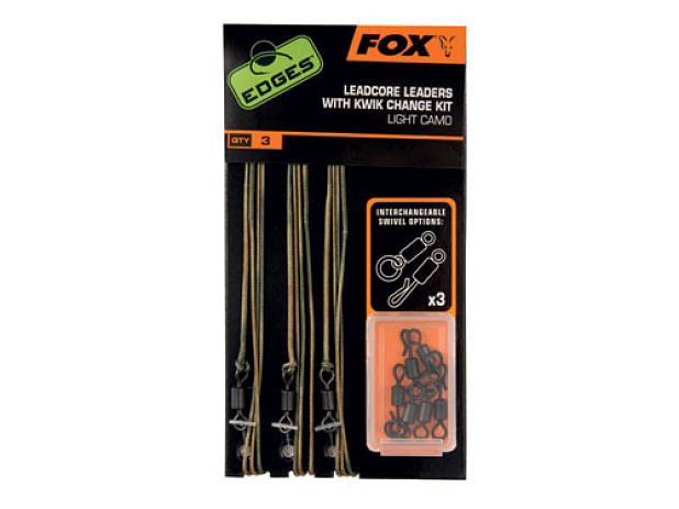 • Tři 750cm dlouhé Edges Camo Leadcore montáže • Dodáváno se třemi možnostmi obratlíku – standard, Flexi Ring a Kwik Change • Smyčky na obou koncích, takže obratlíky mohou být měněny a upevněny pomocí smyčky • Hotové návazce můžeme připojit k obratlíku montáže pomocí smyčky • K dostání ve verzích: Light nebo Dark Camo