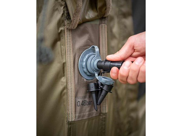 Společenský přístřešek s nafukovacím rámem navrženým tak, aby vydržel mnohem větší zátěž ve srovnání s tradiční konstrukcí. Díky systému nafukovacích trubic jej snadno a rychle nafouknete a kolíky zajistíte do země. Přístřešek je vyrobený z velmi odolné polyesterové tkaniny Fox Khaki s vodním sloupcem 8 000 mm, která poskytuje optimální ochranu před sluncem a teplem díky vnitřní vrstvě „Black Out“ na střešním panelu. Přístřešek je velmi všestranný je vybavený odnímatelnými dveřmi a bočními panely poskytuje různé možnosti větracích oken, zadní vchod lze využít k prodloužení bivaku nebo deštníku. Součástí balení je pumpa s dvojitým pístem a promyšlený systém kotevních šňůr. Tento přístřešek je navržen tak, aby byl spolehlivý v jakémkoli počasí.