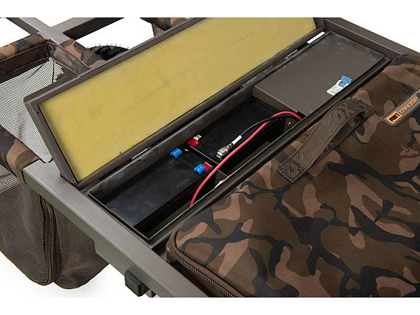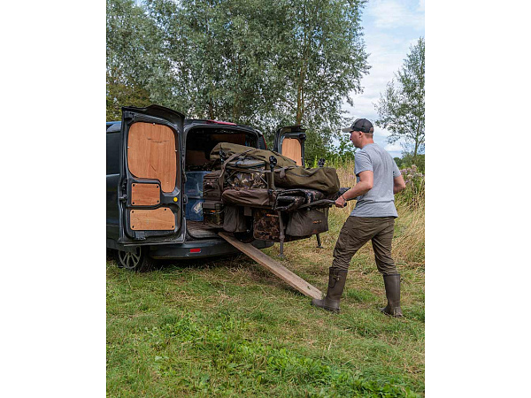 - Spodní taška vozíku je snadno přístupná shora nebo i z obou stran při mobilní rybaření „z vozíku ”