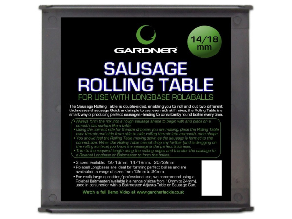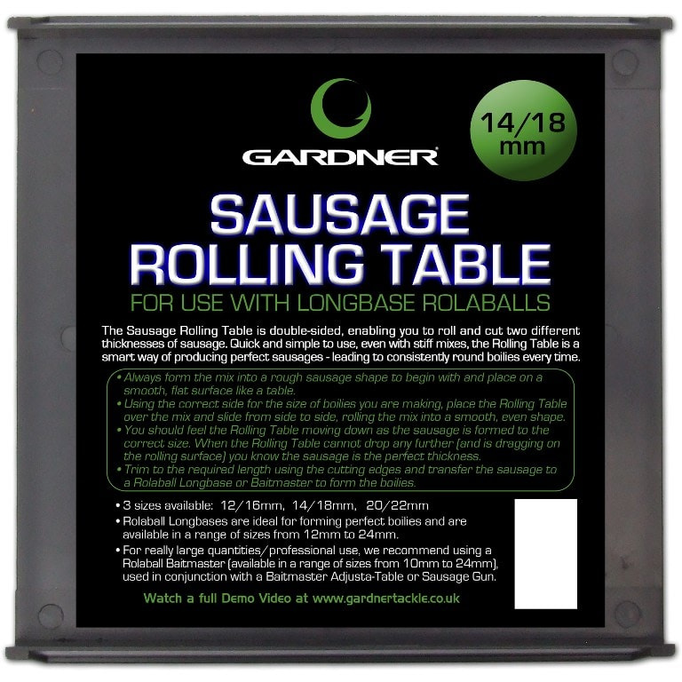 Pokud nechcete používat na boilie těsto tlakovou pistoly, je zde tato rolovací deska. Díky použití z obou stran získáte hned dva průměry k rolování těsta. Technické údaje: Rozměr: 15x15cm Průměr: 12/16mm Průměr: 14/18mm Průměr: 20/22mm Vyrobeno v Anglii, top kvalita. Odkaz na video: http://www.youtube.com/watch?v=4GBEyBWUc2U