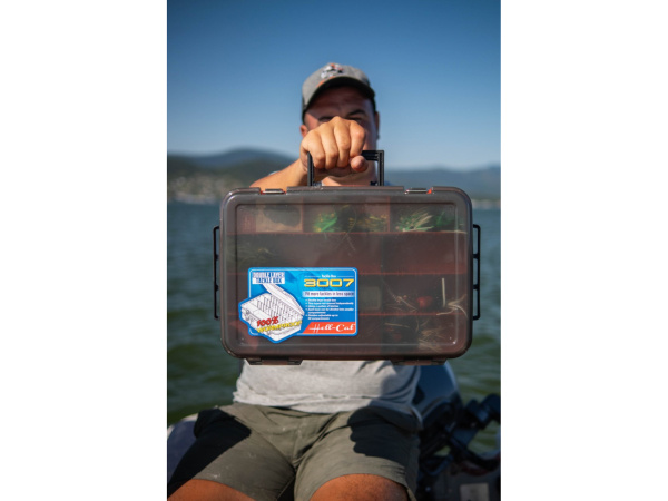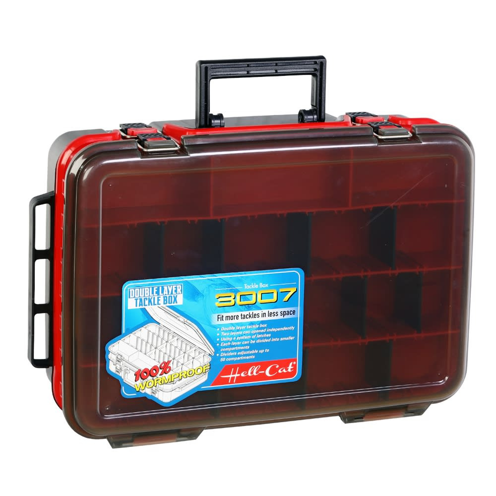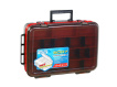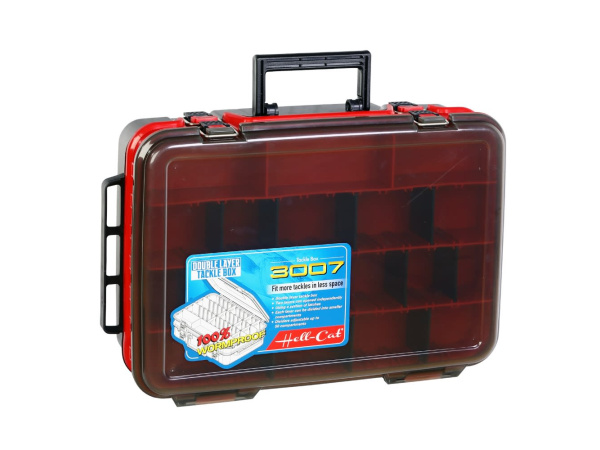 Kvalitní voděodolný dvoupatrový kufřík, který má dvě samostatně uzavíratelná patra. Praktický kufřík, který obsahuje dvě samostatně uzavíratelná patra, které uzamykají kovovými přezkami. Každé patro má nastavitelné přihrádky, spodní 9 větších a vrchní 18 menších.Na bocích jsou dva manipulační úchyty, a ve vrchní čísti je hlavní madlo sloužící k přenášení kufříku.Kufřík je vyroben z kvalitního plastu a je voděodolný, což ochrání rybářské doplňky před nežádoucí korozí. Rozměr: 39 x 28 x 13 cm Hmotnost: 1,48 kg