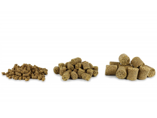 Pelety nabízíme ve 3 a 18 mm, kdy malé (3 mm) jsou vhodné do PVA punčoch a velké s dírkou (18 mm) jsou krom vnazení i skvělou nástrahou pro rychlý lov.