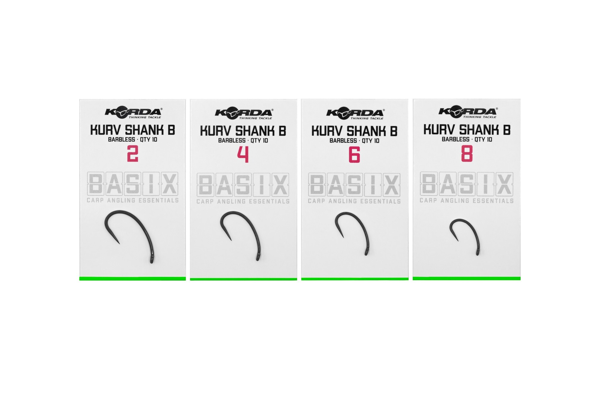 Háčky Basix Kurv jsou k dispozici ve verzích s protihrotem a bez protihrotu ve velikostech 2, 4, 6 a 8, s deseti háčky v balíčku.