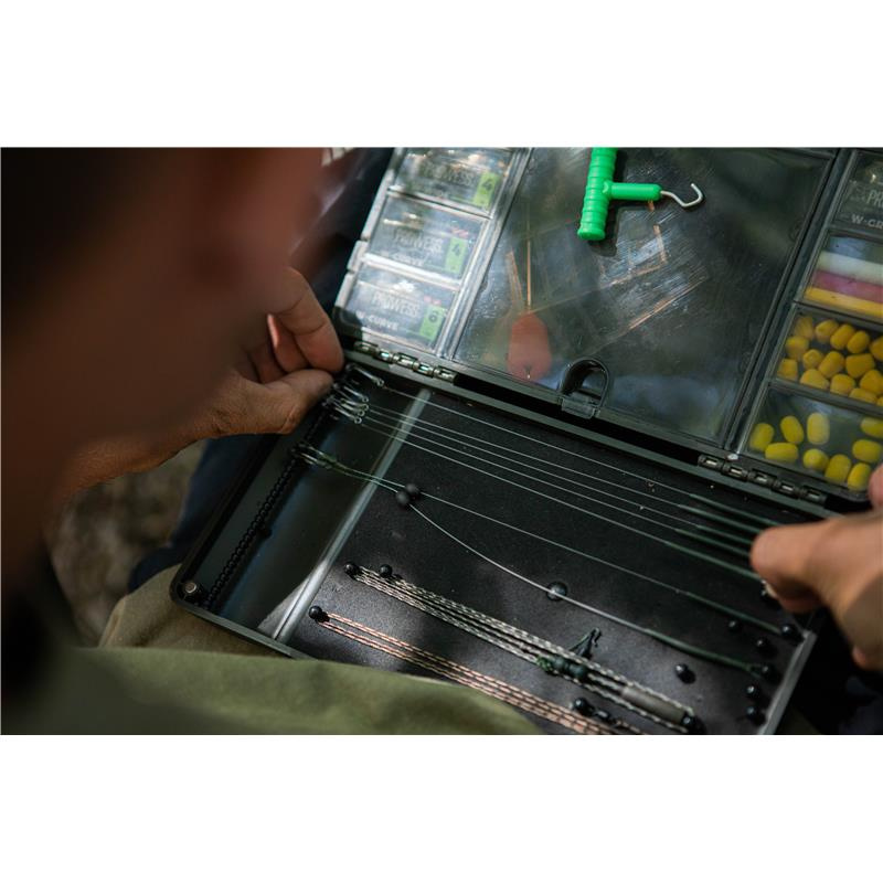 Velmi praktická krabička, která byla vyvinuta pro ukládání připravených návazců a ostatní bižuterie. Vyrobena z pevného, odolného a lehkého plastu. Je vytvarována a díky magnetickým klipům má jednoduchý přístup. Vše s přehledem a na jednom místě. V horní části krabice jsou přihrádky s víkem pro uložení vašeho montážního příslušenství. Spodní část je ideální pro umístění vašich návazců. Specifikace: - délka: 26 cm - šířka: 14,5 cm - výška: 3,5 cm - odolný plast - barva: zelená