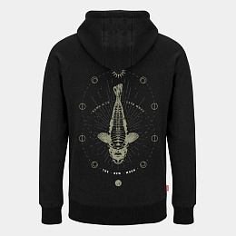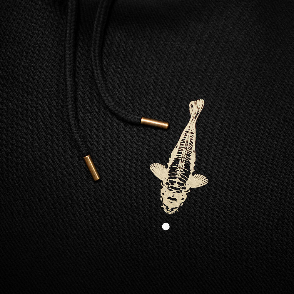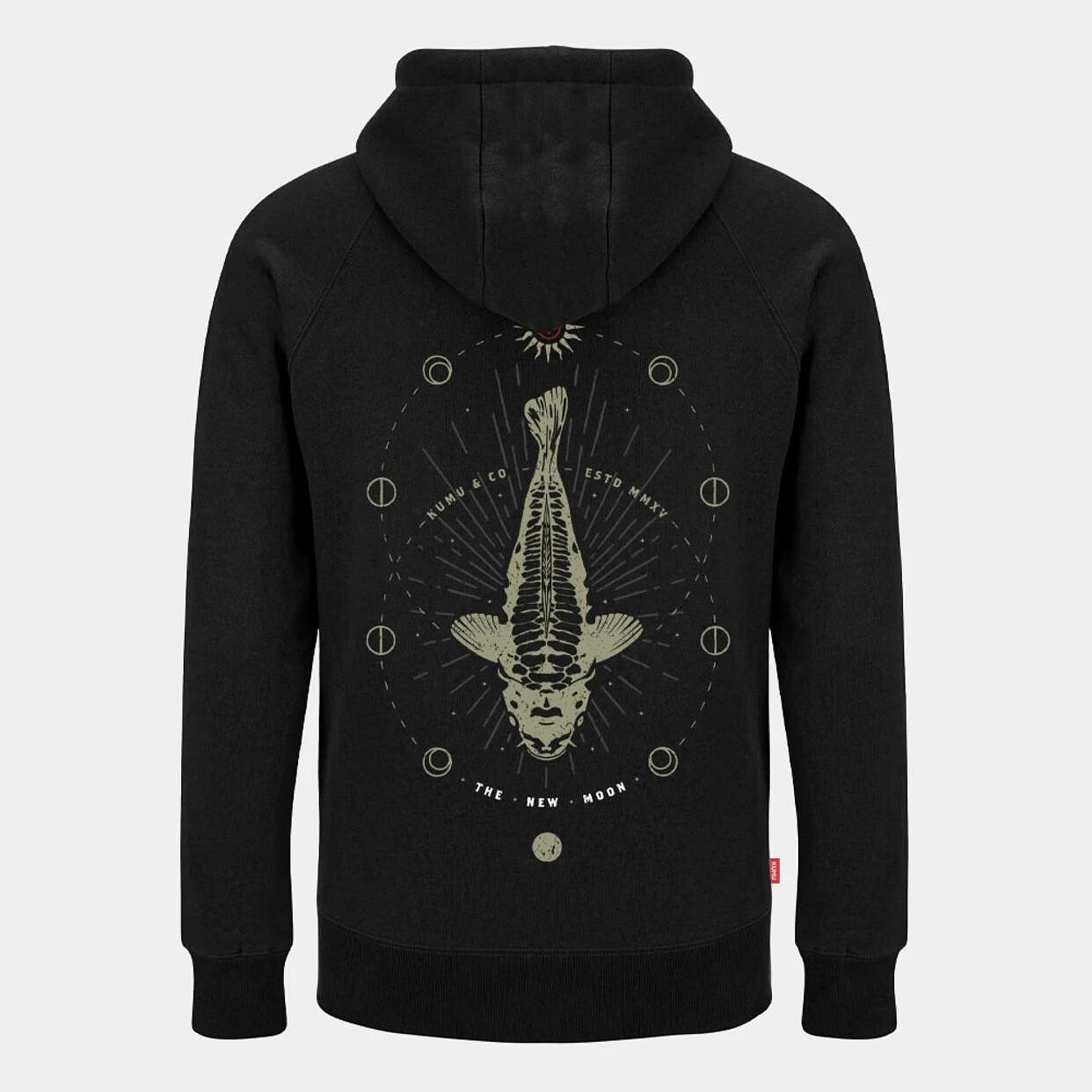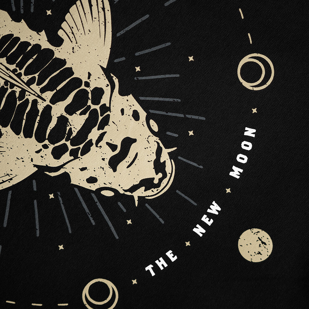 "Naše grafika 'Make Your Own Luck' je již dlouho jednou z našich nejoblíbenějších řad a vždy se vyskytovala otázka: 'Neplánujete verzi s lyscem?' Navrženo jako soubor, který se perfektně doplňuje, naše grafika 'New Moon' vizuálně zpracovává stejný koncept, jak fáze měsíce ovlivňují naši 'štěstí' v rybaření. 4barevný sítotisk na našich super měkkých, luxusních látkách o gramáži 320 g s kartáčovaným zadním povrchem a detaily z antiquovaného mosazi."
