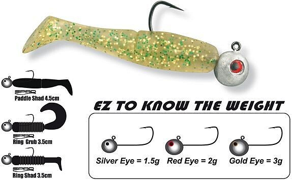 Hmotnost těchto malých jigů je rozlišena barvou očí; 1,5 g střibrná, 2 g červená, 3 g zlatá.