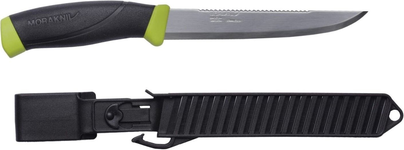 Všestranný dlouhý švédský nůž na ryby prvotřídní kvality se scandi výbrusem pro použití v pravé i levé ruce. Tuhá rovná čepel je vyrobena ze švédské nerezové oceli válcované za studena a kalené na HRC 56,5 Ostří je odolnější proti opotřebení. Ozubená škrabka na šupiny v horní části čepele. Tvarovaná rukojeť s prolisem je vyrobená z odolného plastu černé barvy. Rukojeť je potažena vrstvou měkké přilnavé pryže, odolné proti skluzu. Záštita v zelené barvě zabraňuje sklouznutí ruky a poranění prstů. Polymerové pouzdro s otvory orientované doprava je velmi snadno omyvatelné a usnadňuje odtok. Klip na opasek a poutko na opasek, které jsou zaměnitelné. Otvor pro možnost zavěšení. Baleno v blistru.