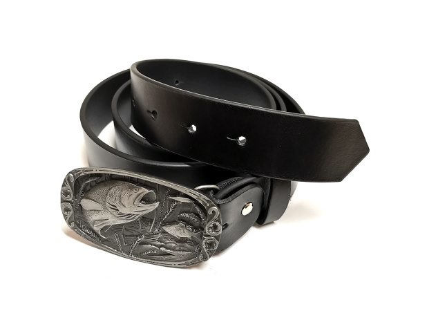 Opasek je vyroben z jednovrstvé nelepené české hovězinové usně černé barvy. Je vybaven zdobenou rybářskou sponou, má jeden kožený posuvný průvlek.