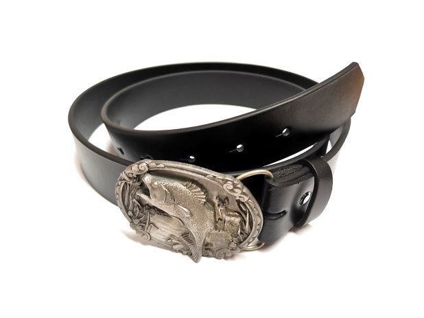 Opasek je vyroben z jednovrstvé nelepené české hovězinové usně černé barvy. Je vybaven zdobenou rybářskou sponou, má jeden kožený posuvný průvlek.