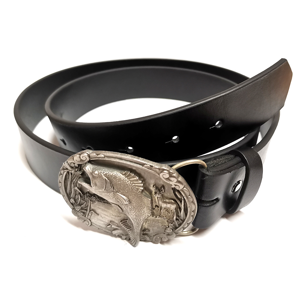 Opasek je vyroben z jednovrstvé nelepené české hovězinové usně černé barvy. Je vybaven zdobenou rybářskou sponou, má jeden kožený posuvný průvlek.