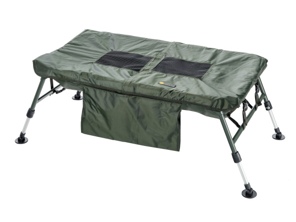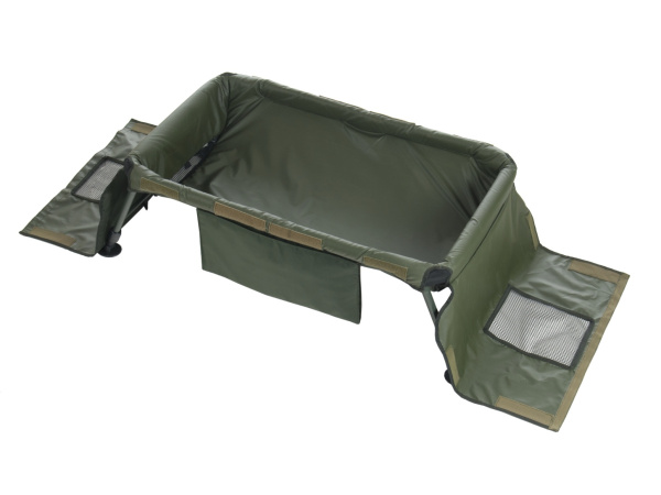 Nekompromisní řešení v péči o váš úlovek. Extra prostorná vanička s trubkovým rámem a čtyřmi teleskopickými nohami pro bezpečné položení úlovku i ve členitém terénu a jeho odháčkování a ošetření. Důmyslně řešené víko umožňuje rychlé uzavření vaničky a napomáhá zklidnění ryby zakrytím její hlavy. Zároveň umožňuje polévání ryby vodou přes pogumovanou mřížku. Voda odtéká otvory na obou čelech. Vanička je doplněna polstrovanou podložkou na klečení při focení a další manipulaci s rybou. Velkou výhodou je minimální transportní velikost složené vaničky.