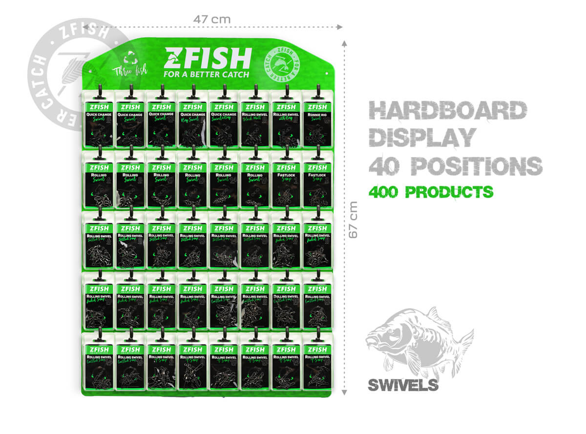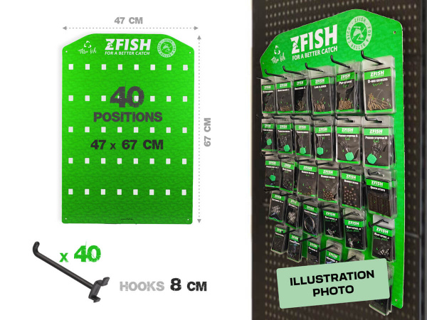SUPER VÝHODNÁ NABÍDKA - Zakupte námi sestavený akční set prémiových produktů a získejte navíc zdarma prodejní plato ZFISH. Součástí tohoto setu je 40 druhů produktů v celkovém množství 400 ks.Ideální pomocník pro dokonalou prezentaci našich nových vymazlených produktů prémiové řady "3FISH". Kvalita materiálu a zpracování těchto plat spolu s elegantním černo-zeleným ZFISH designem zajistí, že se na Vaší prodejně rozhodně neztratí a jsme si jistí, že neunikne pozornosti žádného zákazníka. Plato disponuje velkou plochou k zavěšení produktů na prodejní háčky. Součástí balení těchto ZFISH plat jsou samozřejmě i samotné závěsné háčky a to v počtu 40 ks Technické parametry:Celkové rozměry : 67x47 cmHáčky: 40 ks