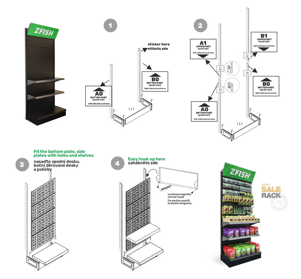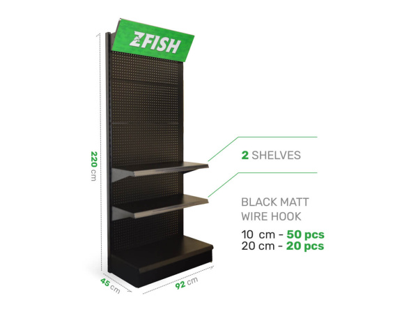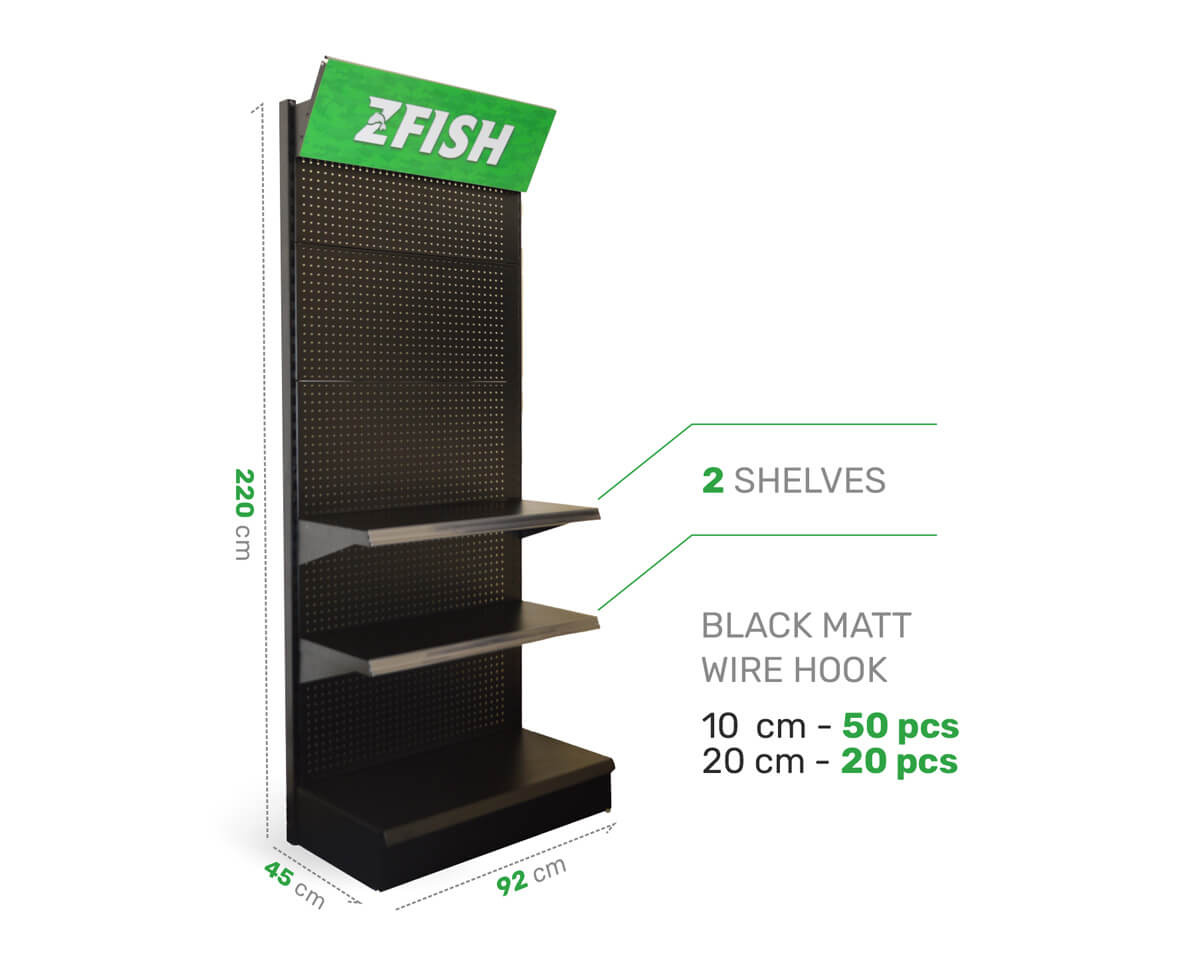 SUPER VÝHODNÁ NABÍDKA - Zakupte námi sestavený akční set prémiových produktů a získejte navíc zdarma prodejní stojan ZFISH. Součástí tohoto setu je 83 druhů produktů v celkovém množství 875 ks. ZFISH Stojan Sales Rack je pevný a stabilní prodejní regál, který je ideálním pomocníkem pro naprosto dokonalou prezentaci našich nových vymazlených produktů prémiové řady "3FISH". Nekompromisní kvalita materiálu a zpracování těchto stojanů spolu s elegantním černo-zeleným ZFISH designem zajistí, že se na Vaší prodejně rozhodně neztratí a jsme si jistí, že neunikne pozornosti žádného zákazníka. Regál disponuje velkou děrovanou plochou k zavěšení produktů na klasické prodejní háčky, a je dále opatřen dvěmi libovolně umístitelnými policemi a i samotná podstava tvoří polici a umožňuje vystavit další produkty. Součástí balení těchto ZFISH regálu jsou samozřejmě i samotné závěsné háčky a to v počtu 70 ks. ( 50 kratších s délkou 10cm a 20 kusů o délce 20cm ). Stojany jsou ssamozřejmě navržené a vyrobené tak, aby šli snadno propojit a seskládat vedle sebe. Technické parametry:Celkové rozměry : 220x92x45cmPolice: 3ks, rozměry: 90x35cmHáčky: 70ks ( 50x1Ocm, 20x20cm )