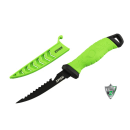 ZFISH Filetovací Nůž Fishing Predator Knife 5"/125mm je nůž s kombinovanou, přesto velice tenkou a pružnou čepelí a je tedy primárně určen ke snandému filetování ryb. Čepel nože "Predator" je tedy jak jsme již uvedli kombinovaná a lze s ní například díky vlnitému hřbetu snadno oškrábat rybí šupiny. Další praktickou částí čepele je broušený zářez, který skvělě poslouží při řezání provázků, pásků, popruhů, nebo při odstranění bužírek z kabelů a podobně. Čepel je zhotovena z kvalitní nerezové oceli s černou povrchovou úpravou a je precizně dílensky zpracovaná a nabroušená. Nůž se může také pochlubit pogumovanou ergonomickou rukojetí pro pohodlný, ale hlavně bezpečný úchop. Nůž je dodáván s pevným plastovým pouzdrem pro bezpečné uložení a transport. Rukojeť i pouzdro jsou provedeny ve fluo zelené barvě, takže nůž nejen dobře vypadá, ale jen tak se Vám neztratí. Kvalitní filetovací nůž z nerezové oceli s kominovanou čepelí v černé povrchové úpravě Délka čepele: 12,5 cm Pogumovaná ergonomická rukojeť pro příjemný a bezpečný úchop Pevné bezpečnostní pouzdro