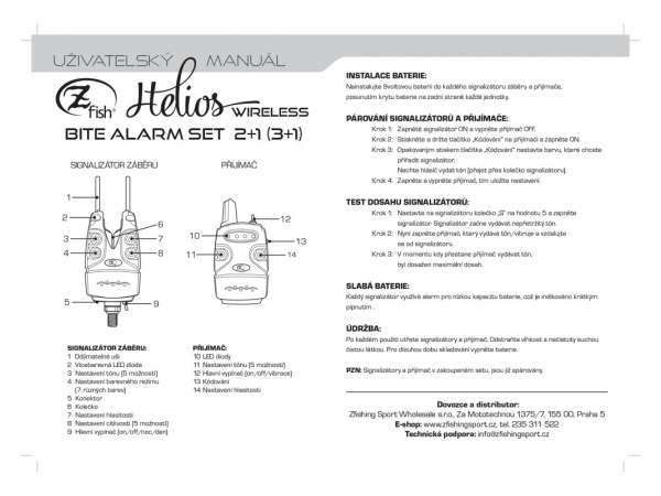 Nadčasový design, vysoká kvalita, maximální výbava, dlouhá životnost a špičkové zpracování. To je základní charakteristika modelu Helios, nejvyšší řady hlásičů od české značky Zfish. U hlásičů lze klasicky regulovat hlasitost, tón a citlivost. Navíc je možné vybírat až ze 7 různých barevných diod. Při nočním chytání se můžete spolehnout na modrou poziční diodu. Tyto hlásiče záběru jsou vybaveny odjímatelnými záchytnými chrániči pro ochranu vašich prutů proti vypadnutí. U příposlechu lze nastavit hlasitost i tón a jeho dosah je až 150 metrů. Můžete si taky vybrat mezi zvukovým, nebo vibračním módem. Rybáři jistě ocení možnost spárování s naším bivakovým světlem. Voděodolnost je samozřejmostí. Sada je dodávána v praktickém kufru, který jí zajišťuje maximální bezpečnost při přepravě. K výběru až 7 barevných diod Odjímatelné chrániče prutu Nastavení hlasitosti, citlivosti a tónu Vibrační mód pro příposlech Přepínatelná noční dioda Varování při vybité baterii Dosah příposlechu až 150m Voděodolnost zaručena Napájení baterie 9V (není součástí balení) *** Lze spárovat se světlem do bivaku Zfish Bite Alarm Bivvy Light (není součástí balení)